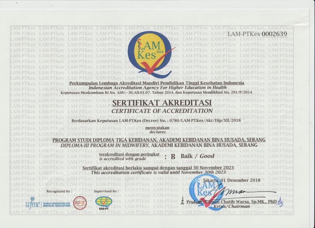 Sesuai SK No.0780/LAM-PTKes/Akr/Dip/XII/2018